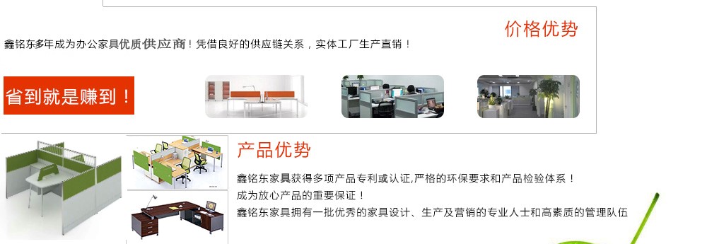 深圳市鑫銘東家具有限公司深圳市鑫銘東家具有限公司專業(yè)銷售各類辦公家具!產(chǎn)品涉及多種系列,如:班臺、班椅、屏風、會議桌、會議椅、辦公沙發(fā)、茶幾、辦公桌、文件柜、電腦桌椅、各式餐臺、餐椅、書柜等辦公家具。 鑫銘東家具擁有一批優(yōu)秀的家具設(shè)計、生產(chǎn)及營銷的專業(yè)人士和高素質(zhì)的管理隊伍。銘東家具以"先難后易"之戰(zhàn)略,在產(chǎn)品結(jié)構(gòu)、產(chǎn)品質(zhì)量及服務(wù)水平方面,均推陳出新,力求完善,精益求精。使我們的產(chǎn)品質(zhì)量保持在國內(nèi)外家具潮流的先進水平,力求滿足客戶的特殊需求。鑫銘東家具多年來致力于環(huán)保、實用家具的設(shè)計與開發(fā),集生產(chǎn)、銷售、服務(wù)于一體。本著"以人為本"的設(shè)計理念,大量開發(fā)符合人體工程學的各種產(chǎn)品,以"誠信為本"的質(zhì)量方針,真材實料,認認真真做產(chǎn)品,實實在在做人。鑫銘東家具更致力于創(chuàng)造"零維修率"的制造境界,實現(xiàn)"沒有維修的服務(wù)才是最好服務(wù)"的口號》了解更多 |